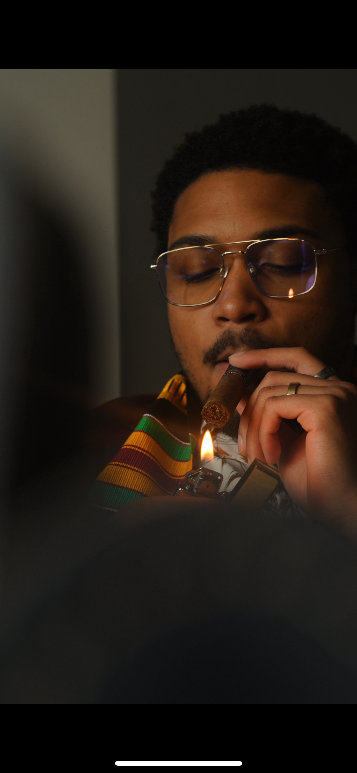 A man with closed eyes wearing glasses, holding a cigar and using a lighter. He is wearing a kente cloth.