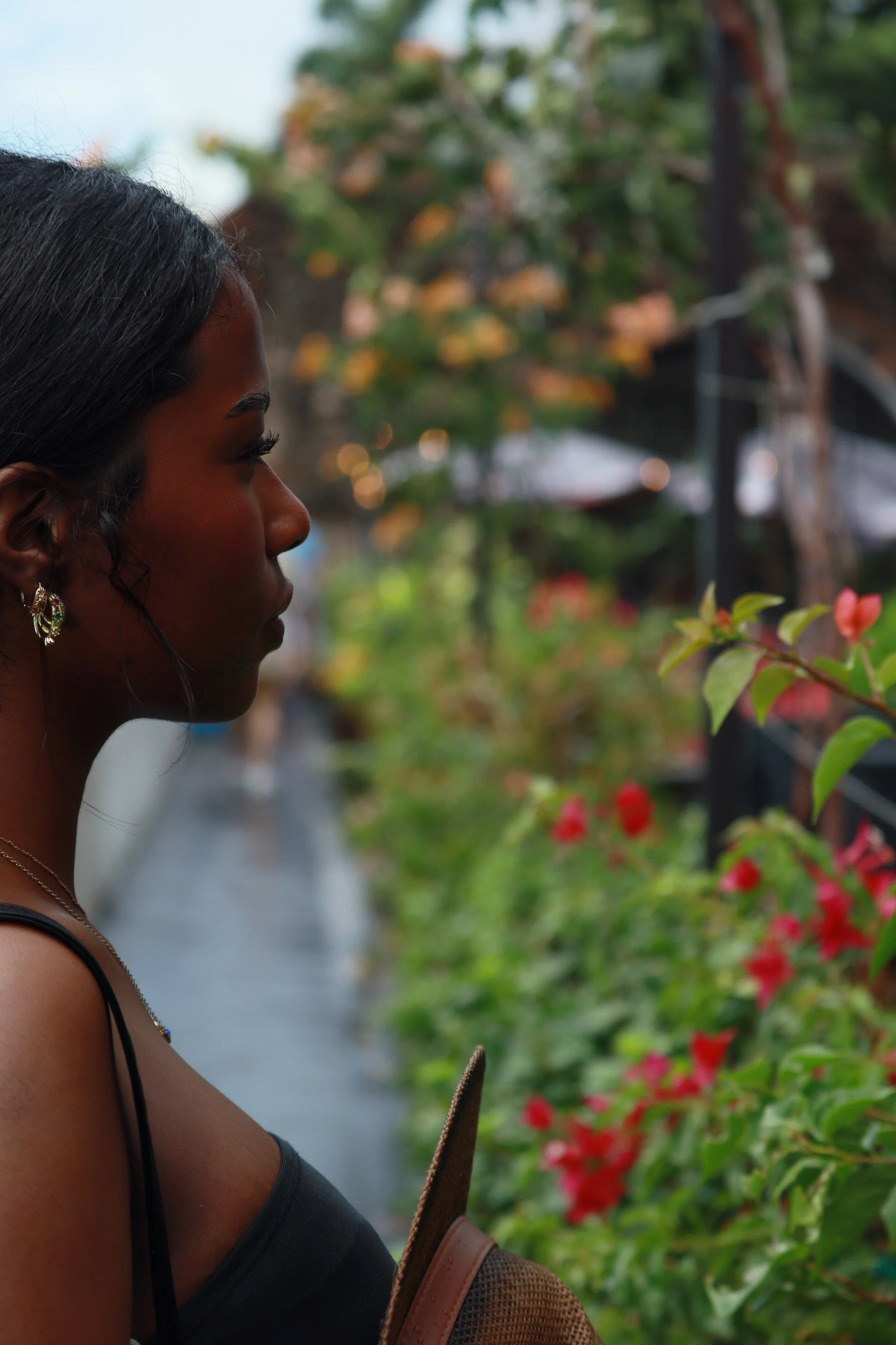 Silhouette of a person with dreadlocks and a white tank top against a clear sky, holding a rectangular object.